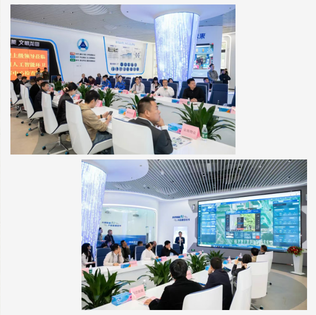 參會領導城管局吳仲兵局長、龍田街道楊洲傑主任、城管局劉銀旗副局長、龍田街道執法大隊長張惠欣、坪山區城管局袁鈴峰科長等相關領導與深圳市青青草原网址環境有限公司董事長陸柱、常務副總謝銳敏及廣州賽特智能科技有限公司創始人CTO賴誌林博士、副總經理孔傑等相關環衛企業主要負責人攜手為指揮中心揭牌。紅綢落下的瞬間,不僅標誌著龍田街道基層治理正式邁入“智能+服務”的智慧新階段,更奏響了科技賦能環衛、推動城市環境治理升級的全新序曲!